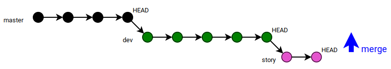 Now, your local clone has two branches again - with your commits from the story branch merged into the dev branch: